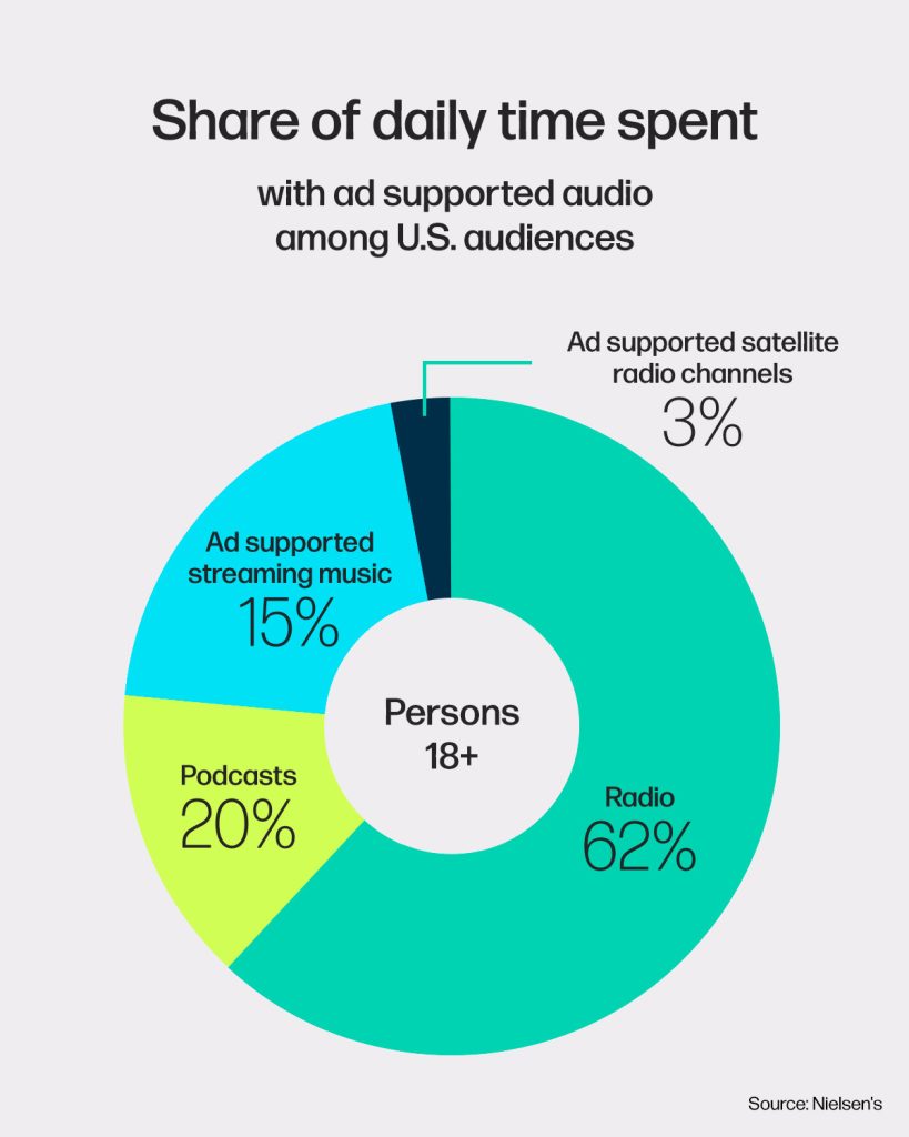 If you want an independent view: Nielsen’s “The Record” shows that in Q3 2025, listeners 18 and older spent 62% of daily ad-supported audio time with radio vs. 20% with podcasts and 15% with streaming audio.